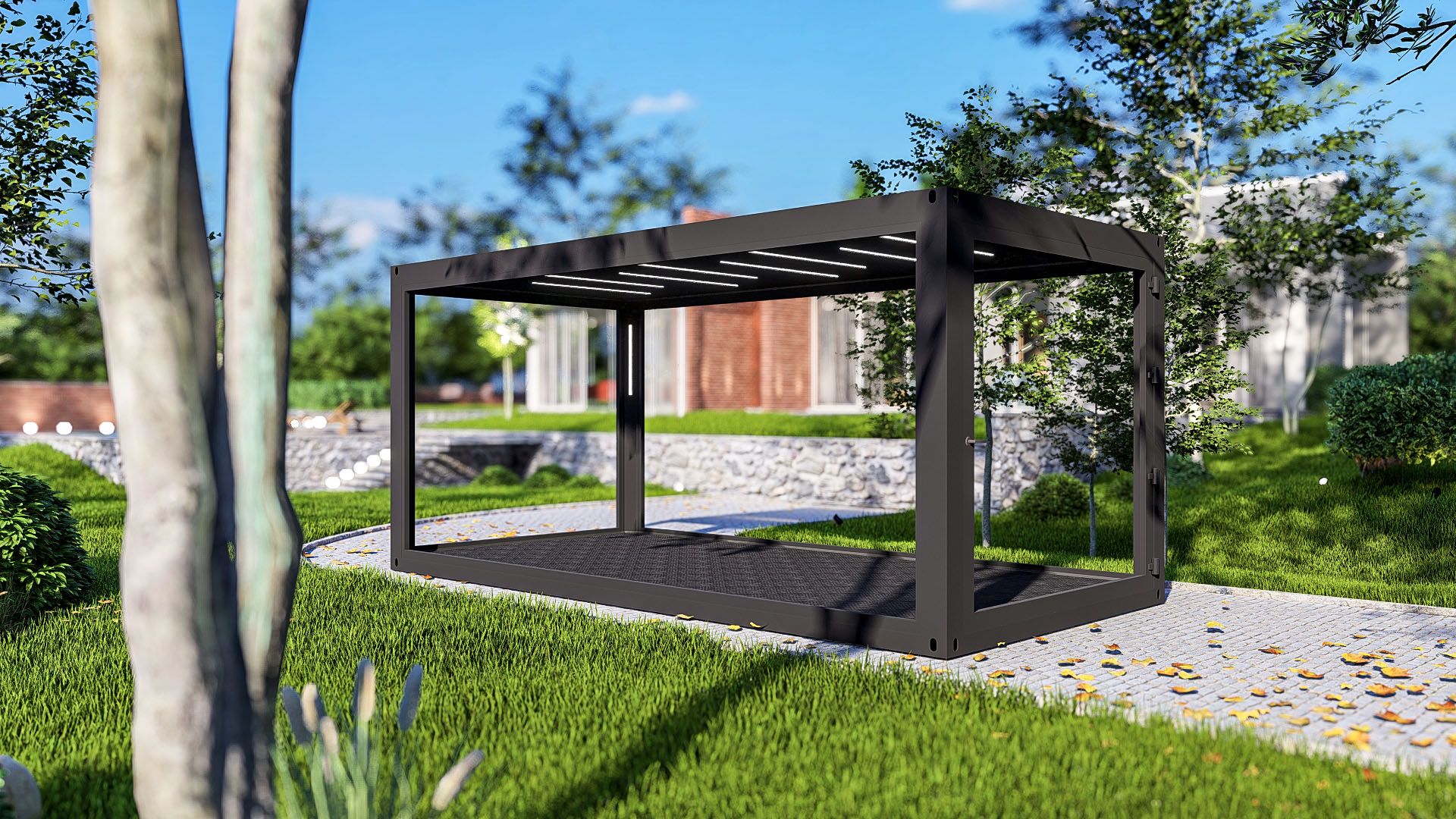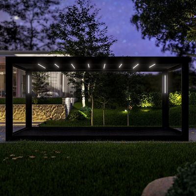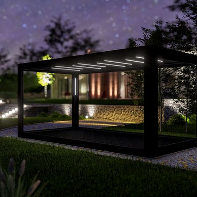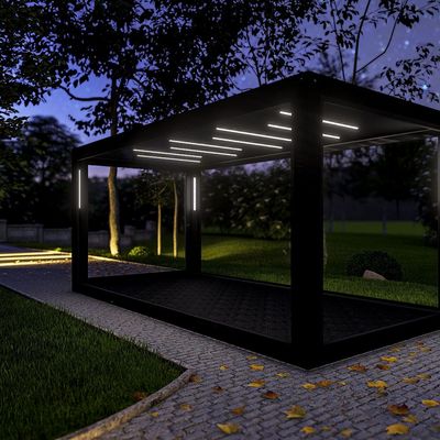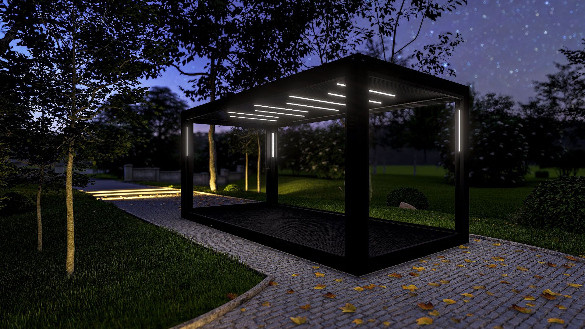 - Deckenverkleidung aus gekanteten Blech-Kassetten in Akustikpaneel-Optik in schwarz mit großflächiger Motiv-RGBW-LED Beleuchtung, dimmbar