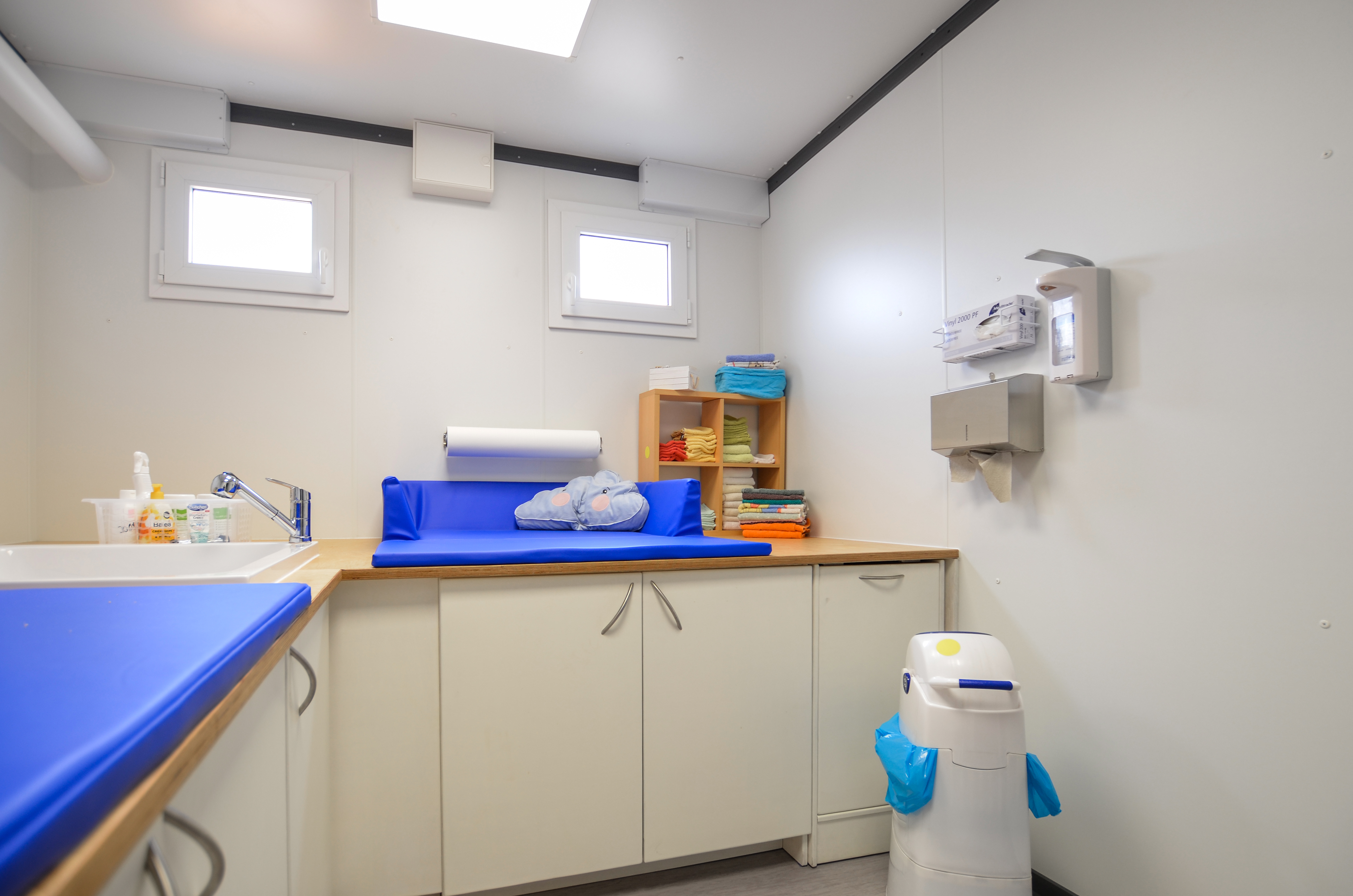 So wurde beispielsweise im Sanitärbereich ein maßgefertigter Wickeltisch mit zwei separaten Wickelplätzen, eine Duschtasse mit Brause, diverse Schränke mit ausreichend Stauraum und einer ausfahrbaren Kindertreppe mit integriert.
